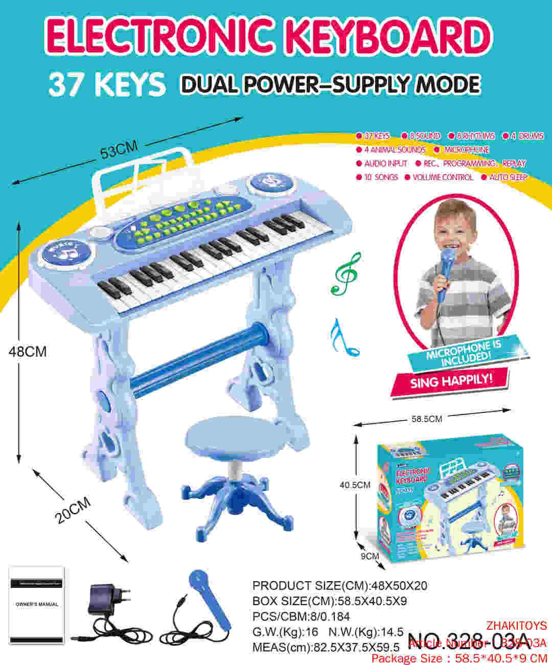 Название продукта: 37 клавиш, синий, руководство, подставка для нот, микрофон, адаптер.